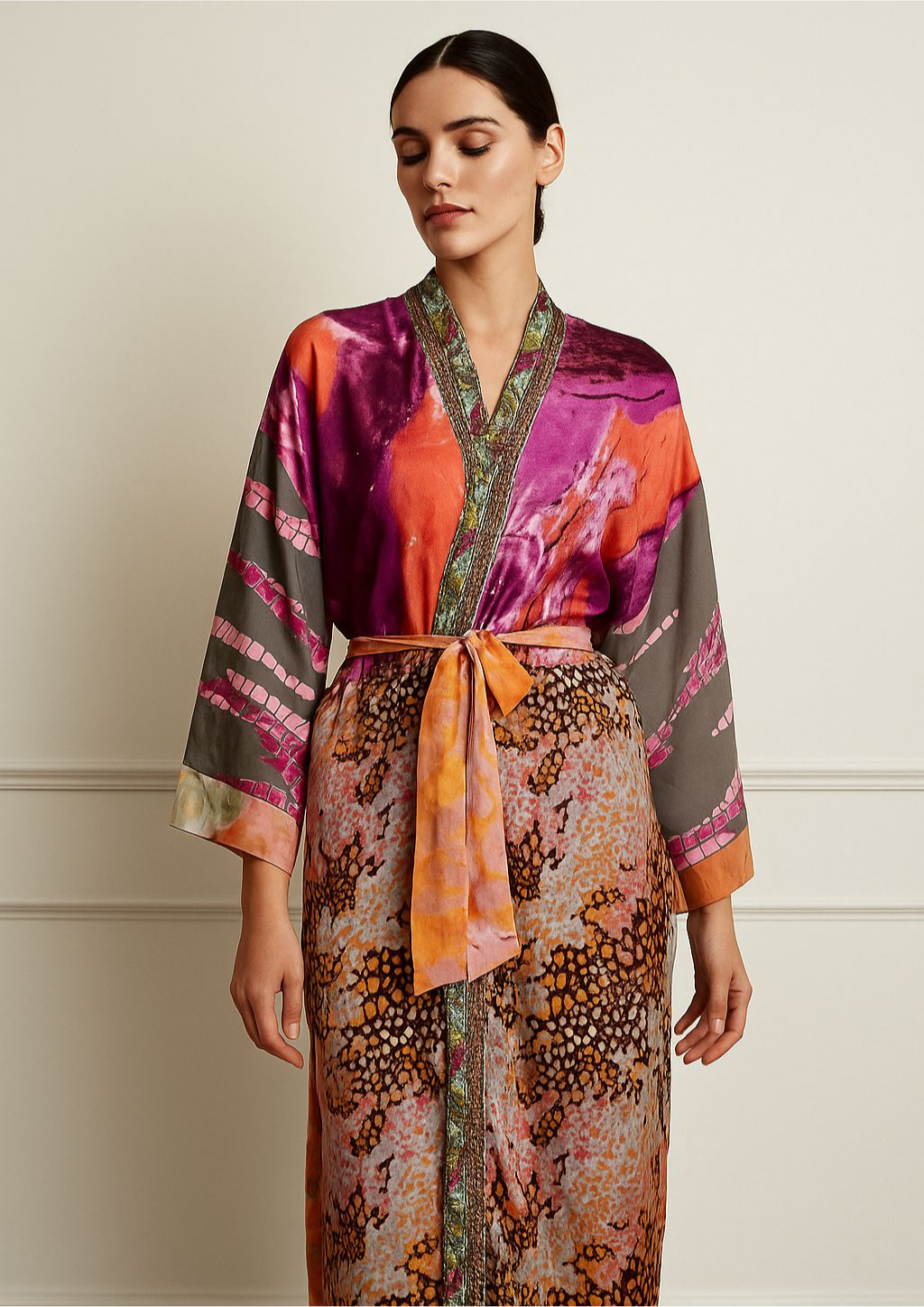 Mooie satijnen kimono die je heerlijk in huis of tijdens je vakantie kunt dragen! Gemaakt in India.